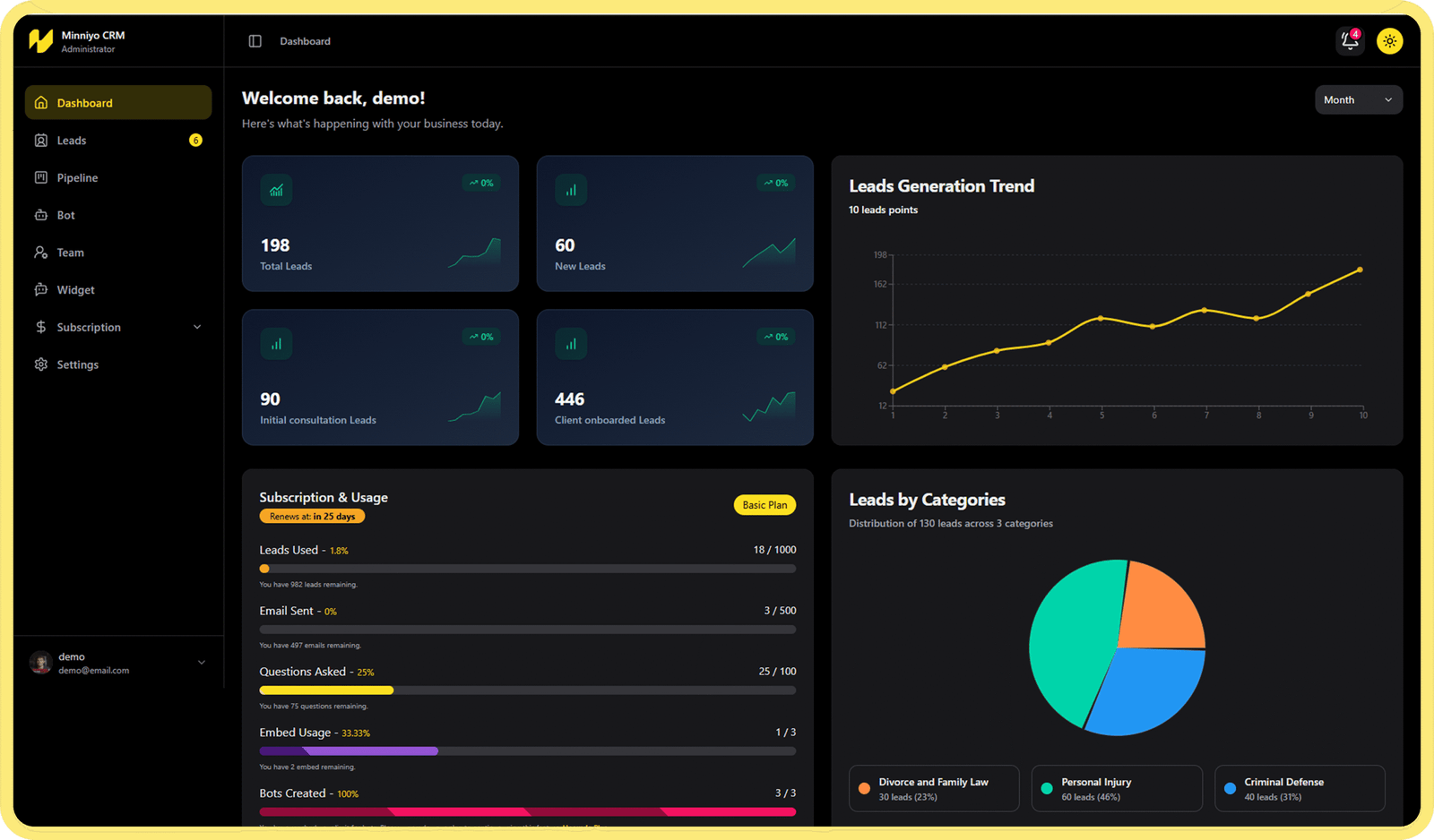 Organize case intake and get more consultations by asking questions upfront. Minniyo can detect case type, urgency, and route qualified leads to CRM for faster follow-up.